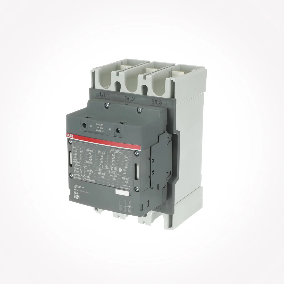 The AF265-30-11-13 is a 3 pole – 1000 V IEC or 600 V UL contactor with pre-mounted auxiliary contacts and Main Circuit Bars, controlling motors up to 132 kW / 400 V AC (AC-3) or 200 hp / 480 V UL and switching power circuits up to 400 A (AC-1) or 350 A UL general use. Thanks to the AF technology, the contactor has a wide control voltage range (100-250 V 50/60 Hz and DC), managing large control voltage variations, reducing panel energy consumptions and ensuring distinct operations in unstable networks.