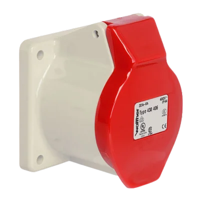 WALTHER Panel socket 32A 4P 400V 6h IP44 straight made from PA6 material finger-safe in accordance with BGV A3 soft transition radius from flange to collar flange 75×75 fixing center 60×60