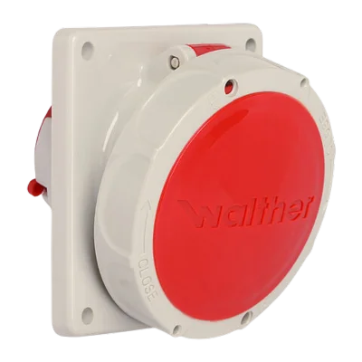 WALTHER Panel socket 32A 4P 400V 6h IP67 angled made from PA6 material finger-safe in accordance with BGV A3 soft transition radius from flange to collar flange 100×92 fixing center 85×77